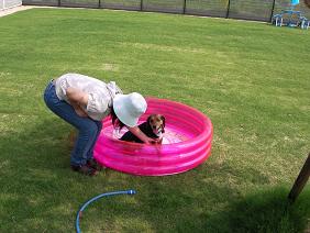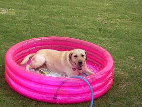 そのラブ君の後ろを匂いを嗅ごうと必死についていくリブ君、飼い主さんが強制的!?にプールへ