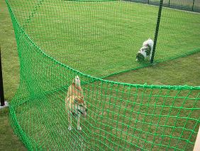 ネット越しのラッキーちゃんが気になるご様子のタロウくん