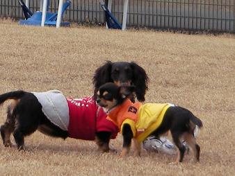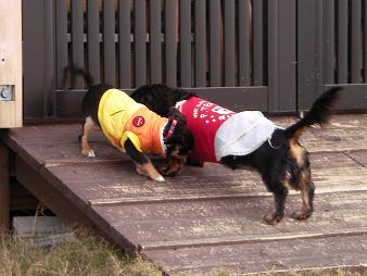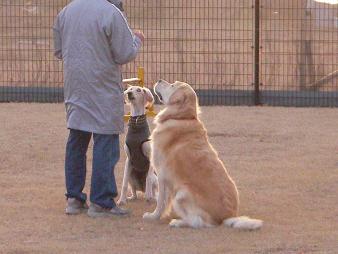 ので、オヤツを飼い主さんに渡し、お座り中の2匹です