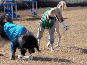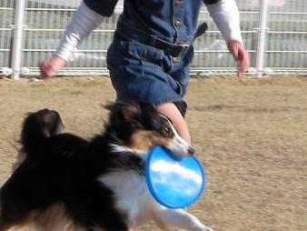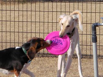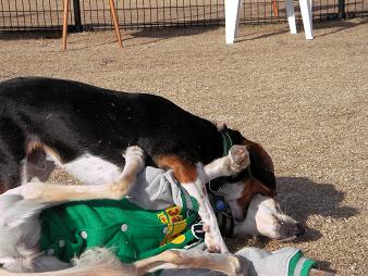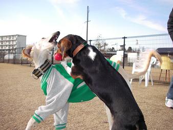 シャープ君のフリスビーを拝借したビーチャン、それをねねぞうが奪おうと取り合い・・・・