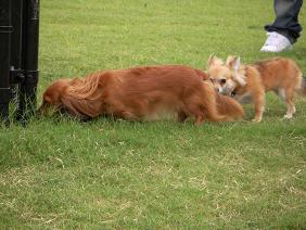 他の子が匂いをかぎに行っただけで、最初はキャンキャンないちゃってたけど、少ししたらクンクンと探索しに飼い主さんから離れる事ができました