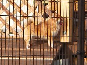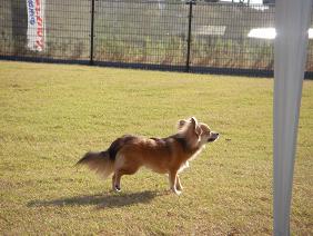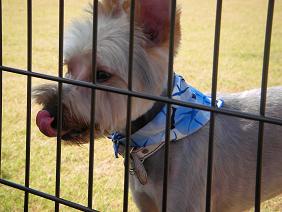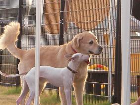 フェンス越しに、隣のフリースペースで遊ぶワンコを見るちーずくん