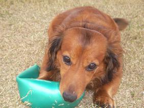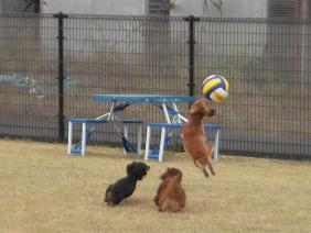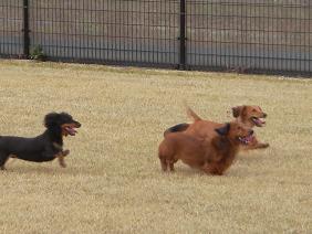 ダックス組み、飼い主さんが投げるボールを左へ右へ追いかける